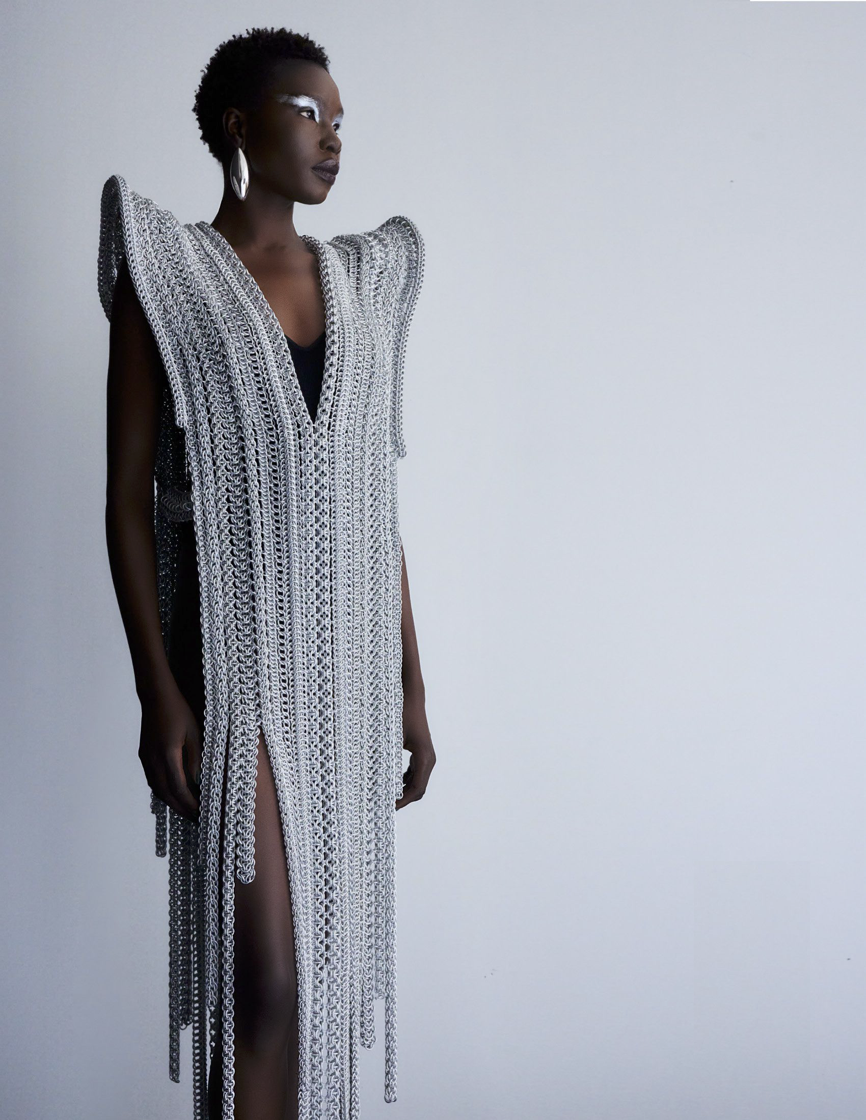 Free Maison’s Jesse and Tay occupied a more conceptual realm, presenting chainmail as both medium and metaphor. Their pieces — part armor, part adornment — blurred binaries of form and function.