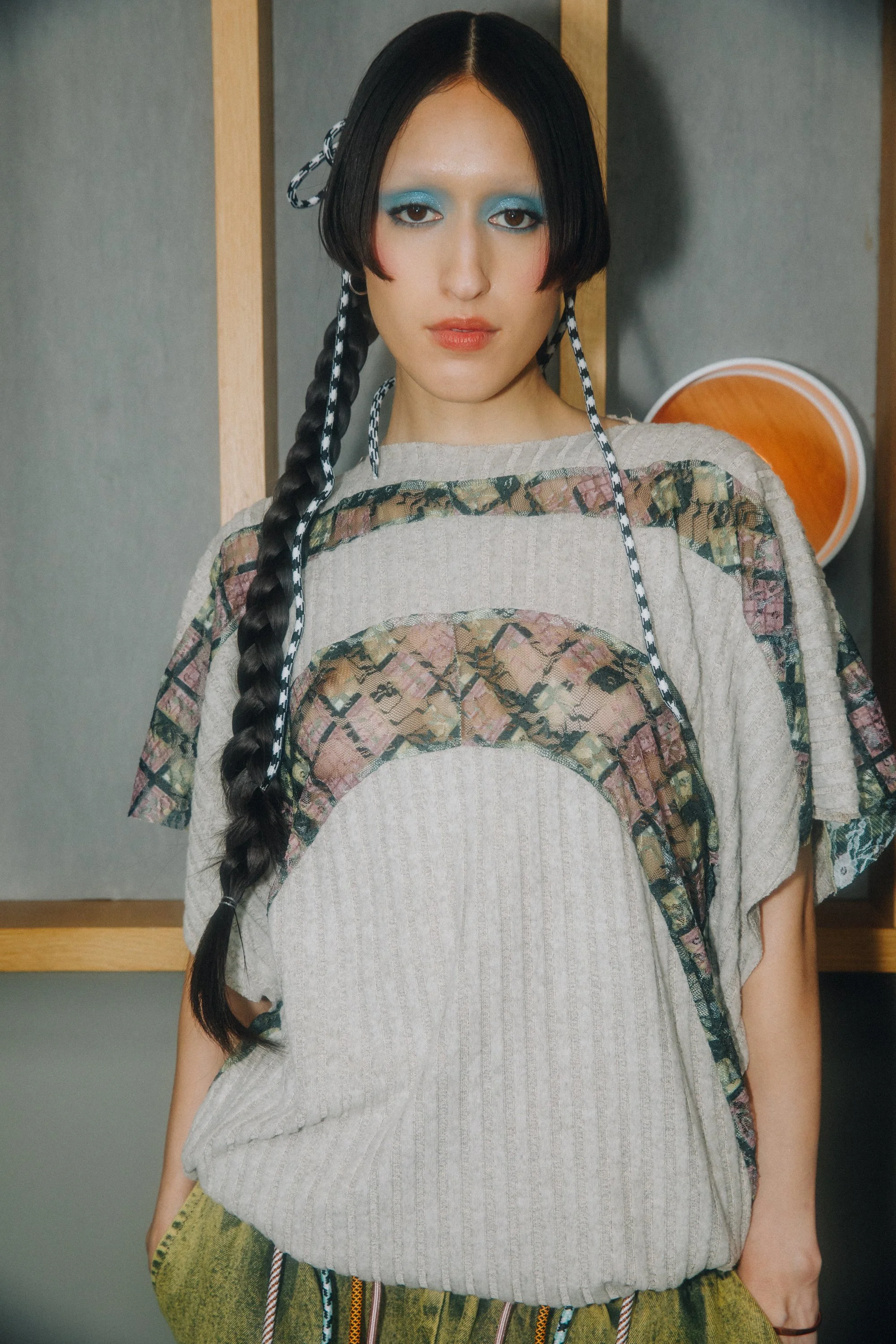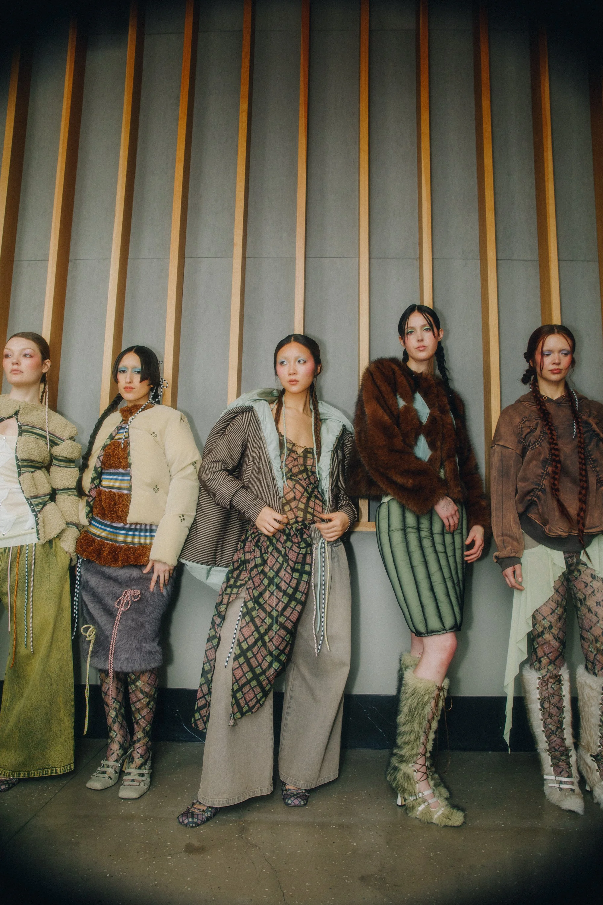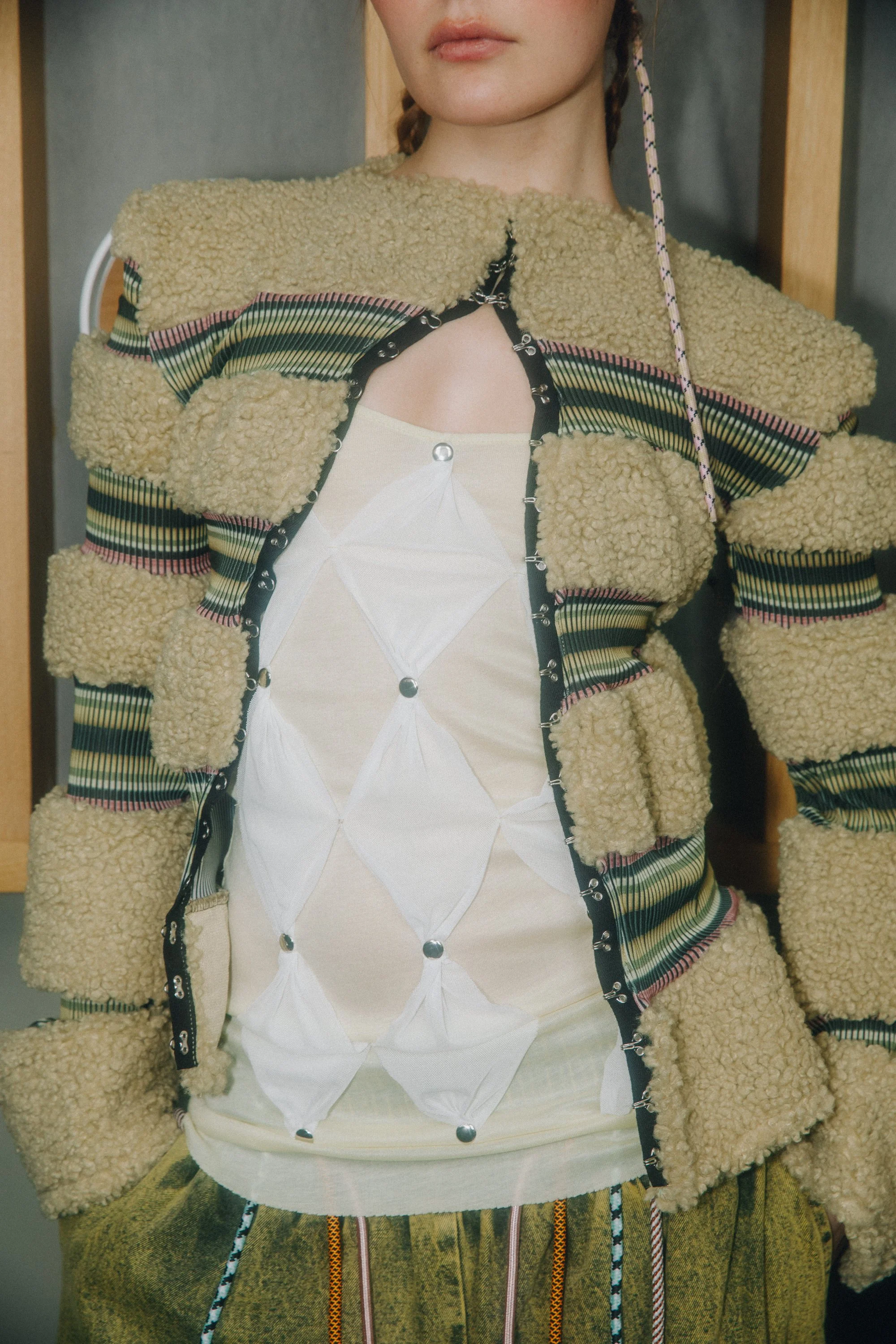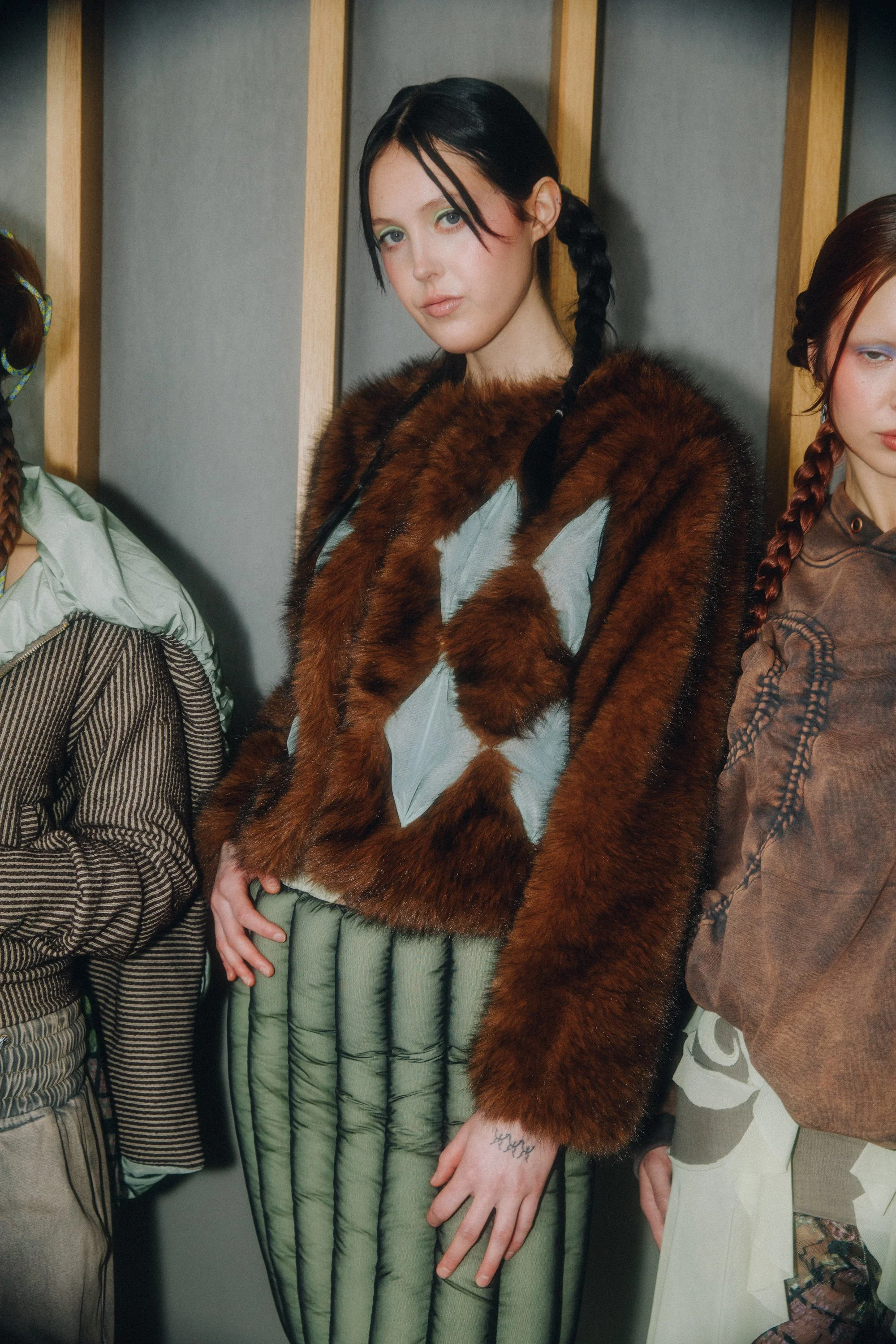 Texture takes center stage in this collection, with depth and tactility defining each piece. A brown faux fur sweater, adorned with leaf-like appliqués, evokes a woodland fantasy, while a quilted skirt mimics tree bark. Meanwhile, structured, shearling-lined jackets with exaggerated paneling emphasize the collection’s meticulous craftsmanship. “I wanted each piece to feel almost like a found object,” the designer explains. “Something tactile, something you’d want to reach out and touch.“
