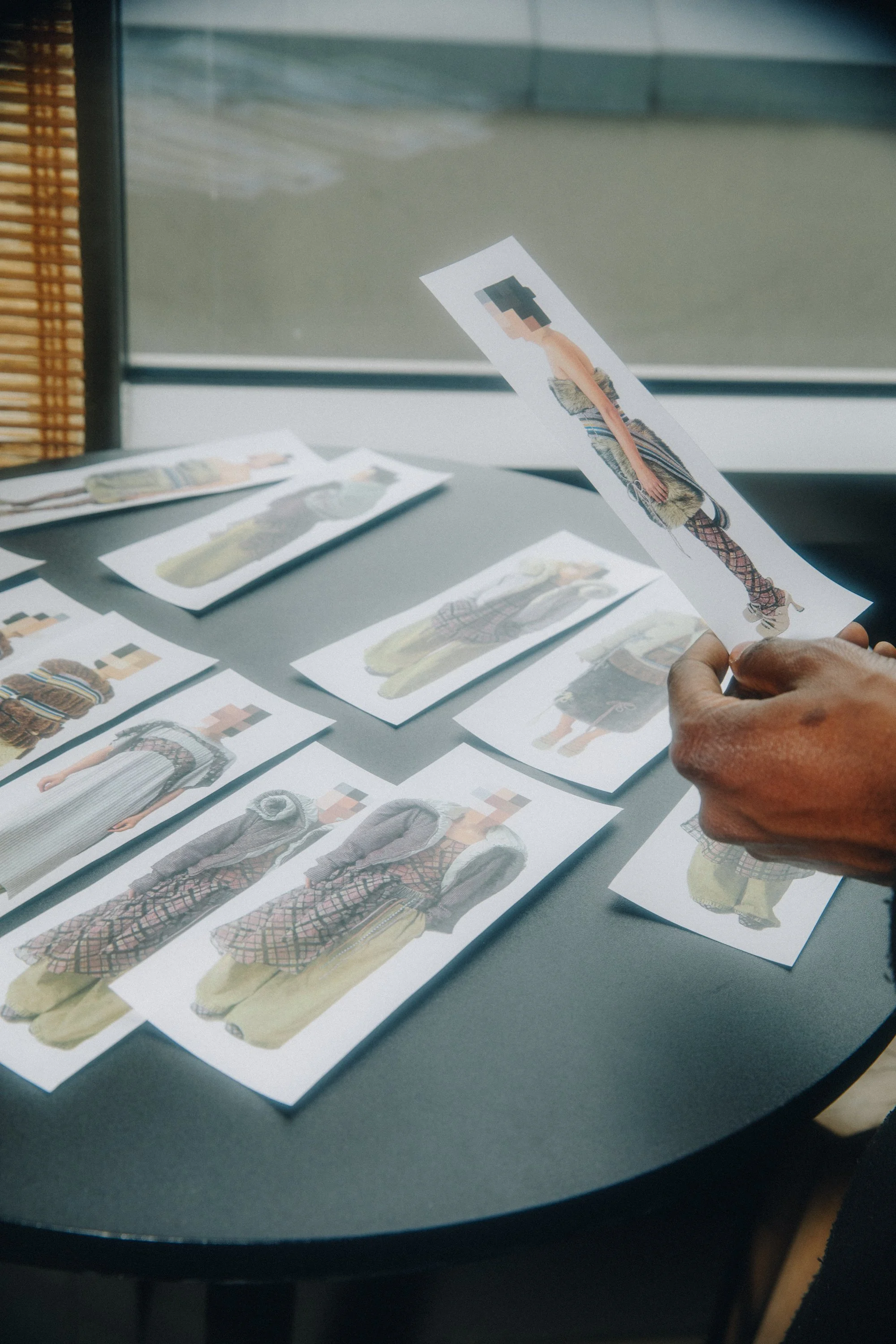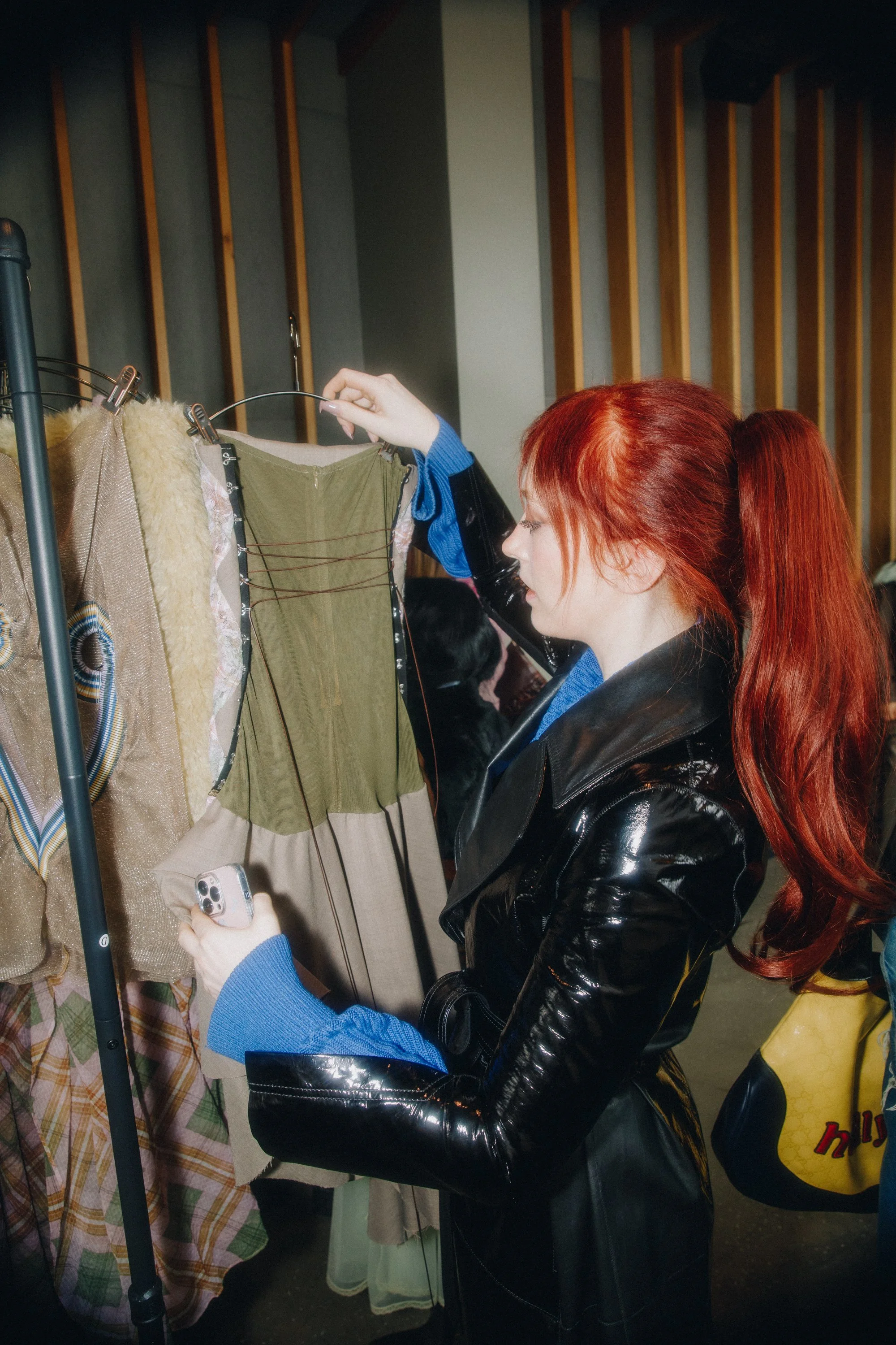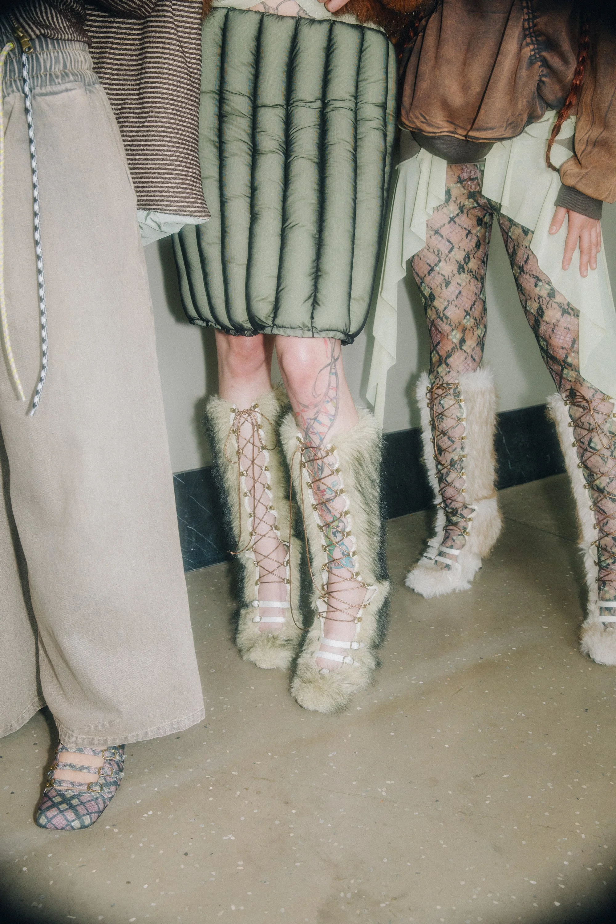 The silhouettes embrace voluminous yet controlled layering, featuring wide-leg pants asymmetrical skirts, and oversized jackets for an effortless draped feel. Crisscross lacing on boots and leggings introduces a corset-like structure, tying the collection’s themes together while adding a touch of architectural elegance. Hidden plaid layers peek through jackets and skirts, offering a subtle playfulness beneath the more structured elements. “For me, fashion doesn’t always just have to be glamorous,“ the designer shares.